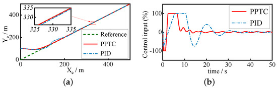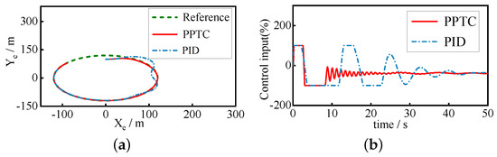In this subsection, the presented predefined-time heading tracking controller is applied to the PRS to follow the straight-line and orbit path. Suppose that the origin of the desired straight-line path is m and the direction is rad; then, the simulation result is given in Figure 5. Define the origin of the desired orbit path as m and the desired radius as 100 m, then the simulation result is shown in Figure 6. Because other dynamics can gradually stabilize as long as an appropriate heading control method is adopted, this section only shows the main states of the PRS. Although that PPTC and PID controller successfully accomplish the following maneuvering, it can be seen that the PPTC provides smaller steady-state error than the PID controller for the PRS subject to internal relative motions and disturbances.