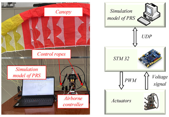 To further validate the effectiveness of the proposed control law, a hardware-in-loop testing platform is used, shown in Figure 7. The hardware-in-loop testing platform consists of a simulation model of PRS, an airborne controller, and a canopy. The airborne controller is composed of an STM32F103 device, and two actuators with potentiometers. Additionally, a 4200 mA·h battery provides power for the airborne controller. It is noteworthy that the simulation model and the STM32 use the user datagram protocol (UDP) for data transmission. The status information of the PRS is transferred from the model computer to the STM32. According to the status information, STM32 uses the proposed method to generate the corresponding control signal. Then, the control signal is converted into pulse width modulation (PWM) and transmitted to actuators to pull the control ropes. After that, the potentiometers transmit the angle change back to the STM32 as a voltage and convert it into a digital signal to the computer. This process is a more realistic scenario.