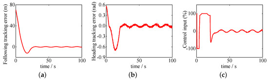 Hardware-in-loop testing results. (a) Following tracking error; (b) heading tracking error; (c) control input.