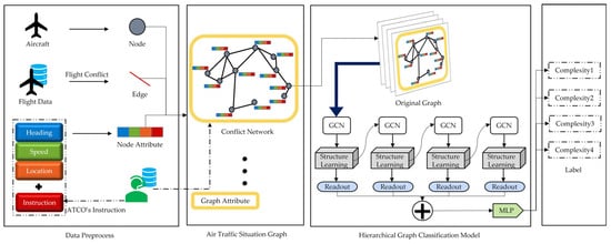 - Data Preprocess: Automatic Dependent Surveillance–Broadcast (ADS-B) transmission equipment was used to gather the sector’s dynamic data, which covered the primary trajectory information and a richness of aircraft operation data. Before converting air traffic scenarios into ATSGs, we collected the relevant instructions from ATCOs and requested that they rank and label their complexity.