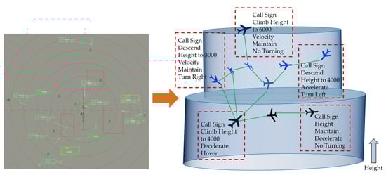 These instructions are delivered to different and complex objects, making it impossible to directly classify them into a cohesive structure, as shown in Table 3. Since this study focuses primarily on the effect of the real-time flying condition in a given sector on complexity, the command-oriented objects are limited to the “ATCO-Pilot” range. Based on this, we abstract the radar screen facing the controller, as depicted in Figure 3, and the two-dimensional plane into a three-dimensional view for ease of comprehension. The cylinder denotes the altitude level at which the aircraft is located, the red dashed box indicates the instruction provided to an aircraft (if no command is given, the aircraft operates autonomously), and the green solid line indicates the possibility of spatial dependency between aircraft. Here is an example of an ATCOI: “CES123, Shanghai, radar identified, PIKAS11 departure, further climb and maintain 2400 m on QNH1012”; from this, we can derive the structure of commands that truly alter the flight attitude of an aircraft, comprising three major elements: altitude command, speed command, and heading command. By coarse-graining the ATCOI employed in our model in Figure 4, the aircraft receiving the command gains the attributes associated with the ATCOI, adding multidimensional features for the ATSG construction in the following step.