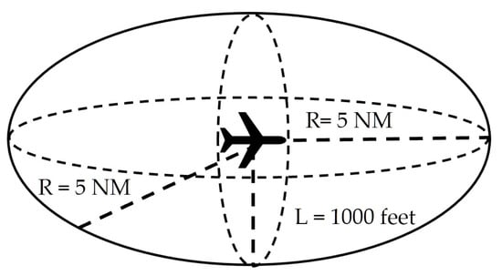 For the spatial proximity, the ellipsoidal flight protection zone for aircraft was established according to the standard interval distance (5 NM (denoted as ) horizontally and 1000 feet (denoted as ) vertically [59]), the one that is most often employed, as depicted in Figure 5.
