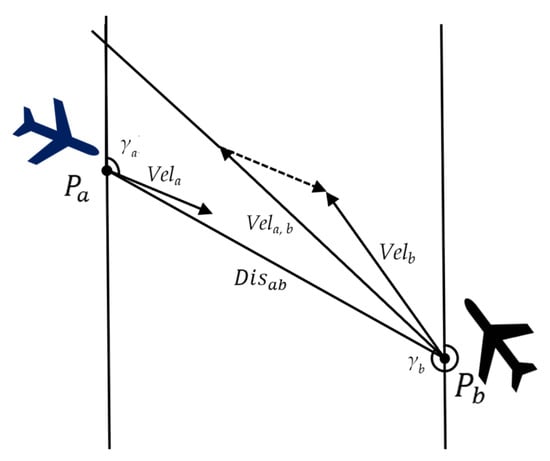 For an uncertain case, such as (c) above, the next step is to calculate the velocity proximity between aircraft to determine if edges exist between aircraft nodes. The proximity effect of an aircraft pair can also be understood as the convergence/non-convergence posture of the aircraft, and the aircraft position and velocity attributes are the most essential elements to analyze this effect. The position and velocity of the aircraft are denoted by Pos and Vel, respectively. The relative distance and relative velocity between and are denoted by and , respectively, as shown in Figure 6. and are denoted, respectively, as Equations (2) and (3).