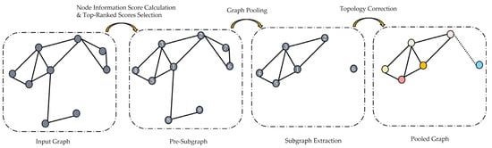 Figure 1 shows our HGRL with structure learning operations between graph convolution processes. According to Figure 7, graph pooling saves a subset of nodes with informatization and generates a reduced size-induced sub-graph (ISG); structure learning refines the ISGs’ graph structure. The benefit of our suggested structure learning method is its capacity to retain the crucial graph structure, which will improve the information forwarding process. If so, the coarsened sub-graph may have nodes that are not connected to each other even though they should be. This makes it harder to transfer information to the output layers, especially when pooling information from adjacent nodes. By layering convolution and pooling processes, the architecture allows for the hierarchical learning of graph representations. After that, the representation of the graph’s hierarchy is calculated as the total of the summaries of each level’s node representations, which is performed with the use of a readout function. Lastly, but certainly not least, the classification work is conducted by feeding the graph-level representation into MLP alongside a softmax layer.