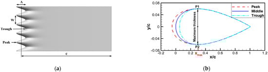 The averaged chord length and projected area of the airfoil with a wavy leading edge are kept the same as the baseline airfoil by stretching or compressing the x-axis. The spanwise section is generated according to the following equation.
