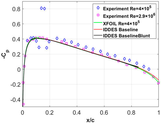 The validation of the CFD simulations was performed using the baseline NACA0012 airfoil. The distribution of pressure coefficient on the airfoil surface is shown in Figure 4. The numerical calculation results using IDDES method in this paper are compared with the XFOIL [37] prediction results and the experimental results of Garcia-Sagrado et al. [38] and Gregory et al. [39]. It can be seen in the figure that the results agree well, which proves the validation of the numerical calculation method for the flow field in this paper. As for the difference between the experimental Re of 400,000 and the simulation results at x/c < 0.2, it may have been due to a trip wire being placed at 12.7% of the chord length of the airfoil’s surface in the experiment to ensure a turbulent boundary layer at the trailing edge [38].