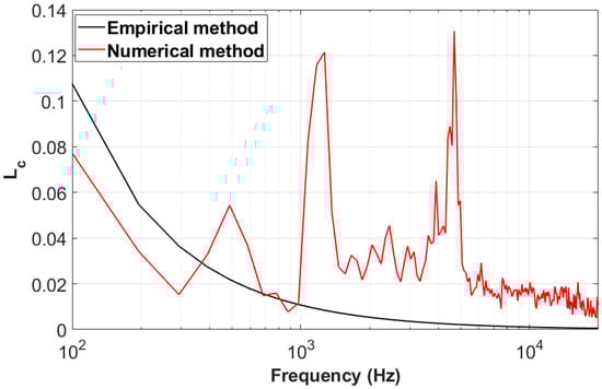 The spanwise coherence length calculated using the IDDES data and the empirical Corcos model [43] given by Equation (10) are shown in Figure 5. It can be seen in Figure 4 that there are great differences between the empirical model and the calculated results, especially around the frequencies of vortex shedding from the trailing edge. It is proved that Corcos’s model cannot be used for the prediction of spanwise coherence length for trailing-edge vortex shedding. Consequently, it is necessary to firstly compute the spanwise coherence length based on the high-fidelity numerical methods or high-resolution experiments before Amiet/Howe’s model can be used for bluntness-noise prediction.
