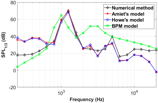 As shown in Figure 6, the noise spectra predicted by Amiet’s and Howe’s models are basically consistent, and the noise spectrum predicted by the IDDES/FW-H method agrees well with the above two models in the range of 600–10,000 Hz. The low-frequency noise and vortex-shedding noise predicted by the present numerical method are also in good agreement with the BPM model. However, obvious differences are observed in mid- to high frequencies, which might be due to the limitations of the semi-empirical model [44].