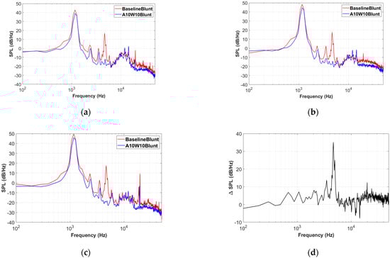 For the baseline airfoil, obvious trailing-edge bluntness noise at 1172 Hz can be observed, whose corresponding Strouhal number (St = fd/U) is 0.18, and the SPL is up to 48.3 dB. What is more, the frequencies of the several noise peaks are all integral multiples of 1172 Hz. For the wavy blunt-trailing-edge A10W10 airfoil, the tonal noise caused by the trailing-edge bluntness is significantly reduced, and even broadband noise at almost all frequencies is reduced. The noise reduction level at 90° shown in Figure 8d clearly gives the noise-reduction characteristics in the frequency domain. A maximum noise-reduction level of 35 dB occurred at 4688 Hz, which is four times the characteristic frequency of 1172 Hz. Local maximum noise reduction levels of 7 and 13.8 dB were obtained at 1074 and 3516 Hz, respectively. At the same time, the SPL of broadband noise was reduced by 2–5 dB on average.