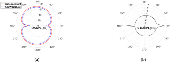 The overall sound-pressure level (OASPL) reduction effects of the wavy airfoil are shown in Figure 9. Seventy-two receiver points with an interval of 5° were set to plot the directivity pattern. The frequency range used to calculate the OASPL was 100–10,000 Hz. As shown in Figure 9a, the directivity pattern of the two airfoils exhibits a typical dipole sound source. The use of the wavy leading edges can reduce the aerodynamic noise at all azimuthal angles. The maximum OASPL reduction was about 6.3 dB at 0°. The noise reduction level at 195° was the smallest, which was about 3.1 dB. Overall, the noise reduction effects at downstream locations were slightly better than those at upstream locations.