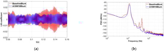Comparison of the lift coefficient between the baseline airfoil and A10W10 airfoil: (a) time domain; (b) frequency domain.