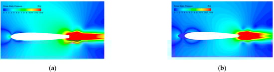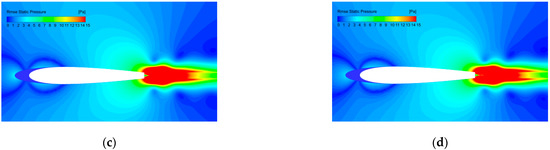 In this study, the incoming flow speed was 40 m/s, and the outlet pressure was 96,400 Pa. The periodic boundary condition in the spanwise and the adiabatic non-slip boundary condition on the airfoil surface were used. The k-ω SST (shear-stress transport, SST) model was selected as the turbulence model. The pressure-velocity coupling scheme used was the SIMPLEC algorithm, and the momentum spatial discretization was solved by the bounded central-differencing method. A bounded, second-order implicit scheme was used for time-marching with a time step of 1 × 10−5 s. After the convergence of the unsteady calculation, the acoustic model was turned on. The flow field was recorded for 10,000 timesteps, and the corresponding physical time was 0.1 s. Then, the Ffowcs Williams-Hawkings (FW-H) equation was solved for far-field noise prediction.