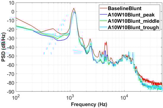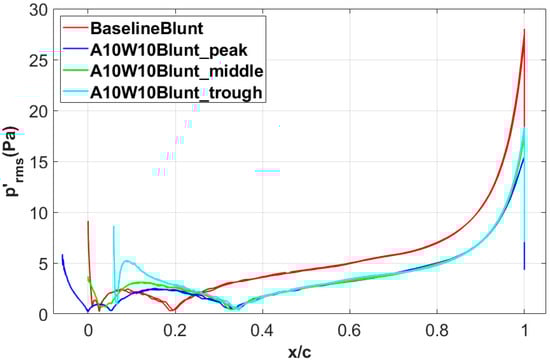 The distribution of the pressure fluctuations on different spanwise locations of the baseline and A10W10 airfoils are shown in Figure 12. The baseline airfoil takes the mid-span section, and the wavy airfoil takes the peak, middle and trough positions, respectively. It is proved once again that the wavy leading edges can effectively reduce the pressure fluctuations near the airfoil blunt trailing edge, thereby suppressing the generation and radiation of an airfoil’s trailing-edge bluntness noise.