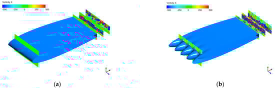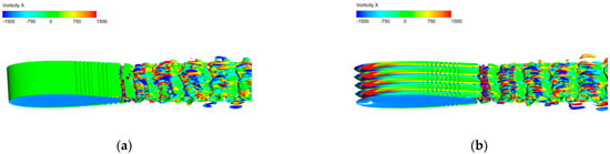 Figure 15 shows the iso-surface of the Q-criterion (Q = 150,000 s−2) colored by the streamwise vorticity for the baseline and wavy airfoils. For the baseline airfoil shown in Figure 15a, shed vortices are generated in the middle section of the airfoil, and finally, the large-scale vortex shedding in the spanwise direction can be seen on the blunt trailing edge. For the A10W10 airfoil, the small-scale, counter-rotating streamwise vortex induced at the wavy trough destroys the large-scale spanwise vortex structure generated by the vortex shedding of the blunt trailing edge to a certain extent.