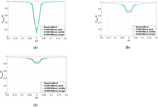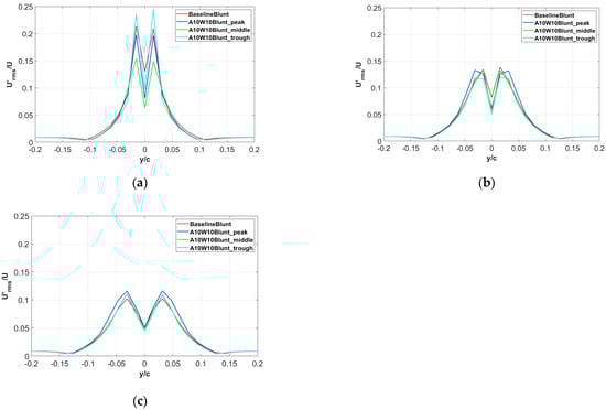 Distribution of the mean streamwise velocity in the wake region: (a) x = 1.1c; (b) x = 1.2c; (c) x = 1.3c.