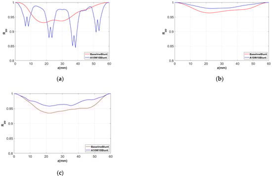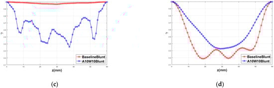 Figure 19 shows the distributions of the pressure fluctuation correlation coefficient at different streamwise locations of x = 0.0c (the airfoil leading edge), x = 0.95c and x = 0.98c. The time histories of the fluctuating pressure at 65 spanwise monitor points of each streamwise position were recorded for the correlation analysis. It was found that, at the leading edges of the airfoils, the spanwise correlation is effectively reduced by the wavy configuration and has a periodic distribution, and its period is consistent with the wavelength. However, near the trailing edge of the airfoil, the spanwise correlation of the wavy airfoil is increased, which is significantly different from previous results. An increase in the spanwise correlation is not conducive to noise reduction according to Amiet’s and Howe’s noise prediction models, as shown in Equations (8) and (9). Therefore, spanwise correlation is not the main factor affecting the reduction of trailing-edge bluntness noise.