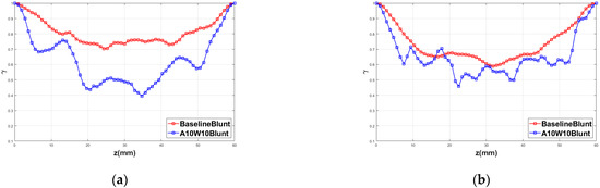 Iso-surfaces of the Q-criterion (Q = 150,000 s−2) colored by the streamwise vorticity: (a) BaselineBlunt; (b) A10W10Blunt.