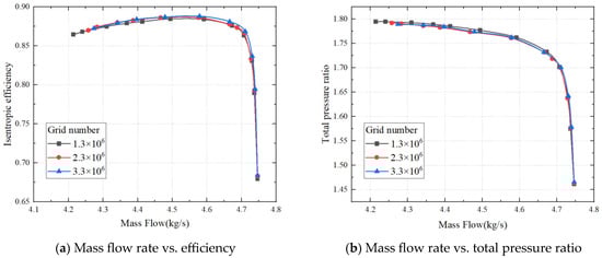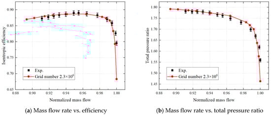 The fully structured grid is used to generate the compressor grid through the IGG/Autogrid5 module using the NUMECA FINE/Turbo package. The O4H topology is used for the blade surface and the O topology is used for the tip clearance. The thickness of the first grid layer near the wall is Y+ < 2. To verify the validity of the numerical method, a 1.5-stage compressor is checked using the numerical method. Firstly, Figure 1 shows that when the total number of compressor grid nodes reaches 2.3 million, the peak efficiency and corresponding total pressure ratio are unchanged when the number of grids is increased, which indicates that the influence of the number of grids on the calculation results can be ignored. Therefore, to ensure the accuracy of the calculation and save calculation costs, a 2.3-million-node grid was selected for the final study reported in this paper. Then, the calculation results were compared with the experimental results. As shown in Figure 2, the calculated total pressure ratio and efficiency are in agreement with the test data for the whole dimensionless flow range, meeting the requirement of engineering calculation accuracy. Therefore, the numerical calculation method selected for this paper can be used to predict the aerodynamic performance of the 1.5-stage compressor and to analyze the flow mechanism.