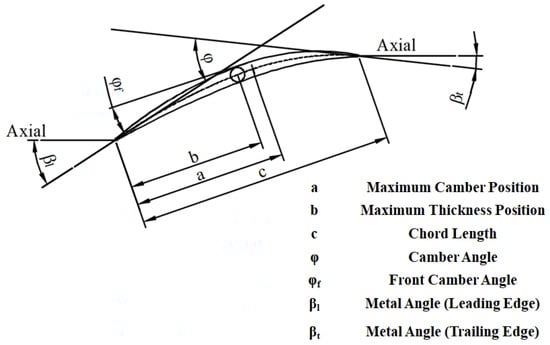 For the parameterization method used in blade shape optimization, researchers mostly use the control points of Basel surface or free-form surface transformation as control variables [27,28]. The advantages of this method are the simple parameterization and easily adaptable control parameters. However, such parameterization methods need to artificially limit the interaction between different data points to prevent the singularity of the majority of lobes identified by the algorithm from meeting the actual engineering needs. In addition, from a data point of view, the optimization results are only related to the coordinate points, which makes it impossible to quantify the effects of independent parameters on the compressor’s performance and limits the designer’s awareness of the real physical flow field. Based on these problems, important design parameters of the MCA blade are extracted as control variables. As is well-known, a 3D compressor blade can be composed of several 2D profiles stacked in the radial direction according to a certain stacking line. The parameters of the MCA blade are shown in Figure 3. Based on the above parameters, the middle arc of the 2D profile can be obtained, the leading edge and trailing edge of the blade are determined using a fixed oval without changes in the optimization process, and the length of the short axis of the ellipse is equal to the diameter of the circle of the blade shape, so as to ensure the continuity of the connection between the front and tail edges, on the one hand, and the suction surface and pressure surface, on the other. Thus, we can obtain a 2D profile. In this study, the 3D blade is composed of 11 sections following a certain stacking line, which controls the sweep and lean of the blade. Figure 4 shows this process clearly.