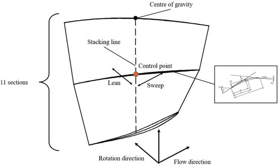 The inlet and outlet airflow angles are determined in the initial stage of the design and are no longer taken as optimization variables. At the same time, to ensure that the blade strength meets the engineering requirements, the maximum thickness of the 2D profile is not changed. Therefore, only the front camber angle and the maximum thickness of the 2D profile are selected as optimization variables in this paper. Based on the above parameter changes, the 3D compressor blade is composed of several 2D profiles stacked in the radial direction according to a certain stacking rule. To control the continuity of the blade surface and reduce the number of design variables, a third-order Basel curve is used to control the distribution of the 2D profile design parameters along the blade height. At the same time, two Bessel curves are used to define the stack line of the blades in order to control the blade, specifically its lean and sweep. If the control point of the stack line changes in the direction of the gas flow, the blade will sweep, and if it changes in the direction of rotation, the blade will lean.