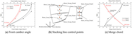The preliminary design determines the distribution of the metal angle of the blades. Thus, the airflow angle is no longer selected as the optimization variable in the subsequent optimization process, and the blade shape parameters are selected for optimization. In this paper, the front camber angle and merge chord, which corresponds to the maximum thickness position mentioned above, of the blade type are selected as the optimization variables of the 2D profile. The physical meanings of the design parameters can be observed in Figure 3. The rotor and stator blades are assembled in 11 segments to form the blades. The blade shape optimization variables in the extension direction are governed by a third-order Bessel curve, as demonstrated in Figure 6. The stack line of the blades is optimized utilizing two Bezier curves to control the blades’ sweep and lean. The ranges of all the optimization variables can be observed in Table 2.