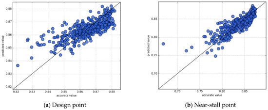 The starting sample points used for training the model were 520 in number. The new points were stored in the surrogate model during the optimization process for each generation and, at the end of the optimization, two points were selected from among all the stored points. After the two points were evaluated using the high-fidelity numerical method, this iteration was finished, and the two points were added into the database, which was used to train the new surrogate model. Throughout 18 iterations, the final sample count in the database rose to 556. To evaluate the surrogate model’s accuracy in the final iteration, for this paper, we employed the leave-one-out method. Figure 7a shows the prediction results for the near-peak efficiency condition, with R2 = 0.759. The results for the near-stall condition can be observed in Figure 7b, where R2 = 0.847. Most of the sample points are close to the 45° regression line, with only a few deviations observed. As the iteration progressed, the optimization space contracted, and points were added to the optimal area, leading to a high fitting accuracy of the surrogate model near the optimal solution. However, the accuracy of the model in terms of the non-optimal areas was not as high, which resulted in a lower global regression coefficient R2 value.