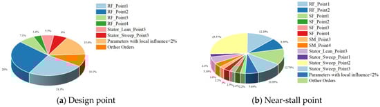 As Figure 8 illustrates, the alteration in the rotor parameters under design conditions significantly affects the compressor efficiency. The front camber angle of the rotors, controlled by four control points, can increase the efficiency by over 3%. The front camber angle of the lower half of the blade has a larger impact, suggesting that the parameter selection at this point is not optimal during the design stage. The impacts of rotor sweep and lean and the merge chord change the compressor efficiency by less than 2%, and this is not shown in detail in the pie chart. In near-stall conditions, the stator parameter changes have a more significant effect on the compressor efficiency. Unlike blade shape changes, which have a larger impact on the compressor efficiency under design conditions, the stacking line of the stator is a crucial factor affecting efficiency in the near-stall conditions, accounting for about 45.7%. Parameters with an influence of less than 2% were not taken into consideration. The rotor blade shape parameters also play a role in the efficiency of the compressor in near-stall conditions, coming second only to the stator sweep parameters. Meanwhile, the stator blade shape parameters have a relatively consistent impact on the efficiency, accounting for over 2%. Additionally, the blade tip parameters have a more significant impact on the efficiency in near-stall conditions than the blade root parameters.