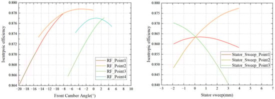 Based on the findings of the sensitivity analysis in Figure 8, the most influential optimization variables for each operating condition were selected. In this case, two parameters, the front camber angle of the rotors and the sweeping shape of the stators, were chosen for an analysis of their impacts on the compressor efficiency. The results are displayed in Figure 9. RF_Point1 and RF_Point3 failed to reach the optimal values due to limitations on the parameter range in this optimization. A more appropriate range should be considered for future optimizations. However, RF_Point2 and RF_Point4 revealed that the isentropic efficiency of the compressor changed from an increasing to a decreasing trend with the changing values, allowing for the determination of the optimal values of these parameters. The sweeping shape of the stator also had a limited parameter range. In further optimizations, the value range of the stator’s sweep point could be increased appropriately based on the consideration of the axial distance of the blade and the difficulty of blade processing.