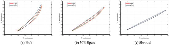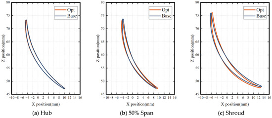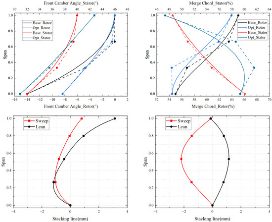 A geometric comparison of the blade before and after optimization is shown in Figure 10 and Figure 11, and the distribution of the design parameter changes in the span direction is shown in Figure 12. The front camber angle near the root of the rotor decreases, and the load on the blade moves backward. This trend gradually decreases with the increase in the blade height. It can be observed that the front camber angle of the blade increases slightly at the 70–90% spanwise position, but due to the smaller front camber angle of the blade near the blade tip, the slight fluctuation in the value also causes a significant change in the blade shape, and at the same time, the merge chord of the rotor blade moves forward as a whole. Due to the local supersonic incoming flow at the root of the stator, the front camber angle near the root of the stator is further reduced. With the increase in the spanwise height, the Mach number of the stator incoming flow decreases, and the front camber angle of the optimized blade shape increases. At the same time, the merge chord of the stator changes slightly near the end wall of the blade after optimization, but the position of the maximum thickness in the middle part of the blade moves backward as a whole.