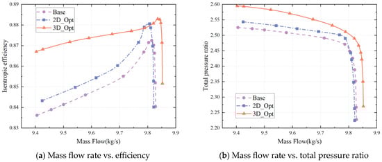 To depict the respective influences of changes in the 2D profiles and stacking lines on the compressor performance, Figure 13 presents the performance lines of the prototype, 2D_Opt, which only considers 2D profile optimization, and 3D_Opt, which takes into account both the 2D profile and stacking line optimizations. Optimization of the 2D profile alone leads to a 0.8% increase in peak efficiency, a 0.7% increase in the maximum pressure ratio, a 0.53% increase in the stability margin (relative to 4.33%), and a negligible 0.07% reduction in the clogging flow. With the addition of stacking line optimization, the peak efficiency rises by 1.05%, the maximum pressure ratio increases by 2.8%, the stability margin increases by 3.5%, and the maximum flow rate increases by 0.25%. The performance curve of 2D_Opt moves upwards and aligns with that of the prototype. The 3D_Opt still shows a noticeable drop in efficiency after the clogging condition is removed, but the decline is much smaller compared to that of both the prototype and 2D_Opt. Further analysis of the compressor’s flow field before and after optimization will be conducted to clarify the mechanism of the improvement in the compressor performance.
