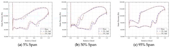 Figure 14 presents the static pressure distribution on the rotor blade surface according to various blade heights under the design conditions. As depicted in Figure 14, the shock at the root of the prototype rotor blade is largely removed, resulting in the absence of shock on the pressure surface. The reduction in the front camber angle of the root of the 2D_Opt rotor, however, reduces the blade load, causing the airflow to remain unaltered until it reaches 30% of the chord length. Past this point, the airflow begins to decelerate due to a series of compression waves, leading to an increase in static pressure on the blade surface. The static pressure curve of the blade surface of the 3D_Opt is the same as that of the 2D_Opt. In all three cases involving the blade root’s suction surface, the airflow undergoes deceleration due to a shock and then continues to accelerate, ultimately forming a weak shock on the suction surface. The shock structure in the channel at 50% of the blade height changes, with the pressure surface now having two weak shocks instead of the original strong shock, due to the impact of blade shape alteration. Meanwhile, the shape of the two shocks on the suction surface remains unchanged. Despite this fact, the static pressure rise distribution reveals that the 2D profile optimization strengthens the first shock on the suction surface and reduces the second shock’s intensity. Although the shape of the shock does not change dramatically compared to the 3D_Opt, the position of the first shock is shifted slightly forward. At 95% of the blade height, the shock structure in the blade channel undergoes only a minor change, with the optimization of the stacking line reducing the load on the leading edge of the blade and weakening the strength of the first shock on the suction surface.