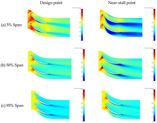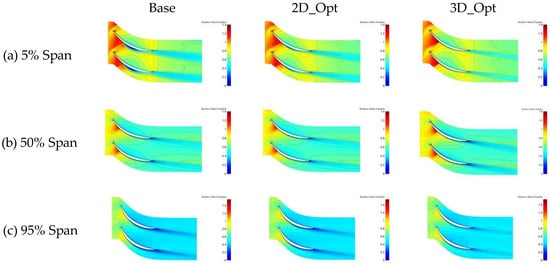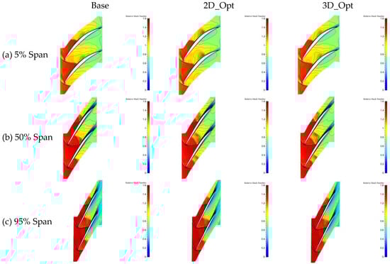 Figure 18 compares the relative Mach numbers at various heights on the stator blade and reveals an increase in the intensity of the shock at the root of the 2D_Opt stator, which is particularly pronounced with the addition of stacking line optimization. The prototype stator’s first shock at the root separates from the blade surface, compressing the flow channel and causing the main flow area to continue to accelerate so as to form a second, weaker shock. After 2D profile optimization, the front camber angle of the stator root decreases, which extends the shock intensity but weakens the separation on the suction surface. Combined with stacking line optimization, this eliminates the separation zone at the stator root and creates a single detached shock in the blade passage. The optimization also reduces the wake area at the tip of the stator, while slightly increasing the wake area in the blade, which suggests a transfer of low-energy fluid from the tip to the blade.