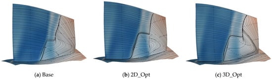 The limited streamline on the suction surface of the rotor blade was analyzed further, and it was found that 2D profile optimization greatly inhibits the intensity of radial migration flows on the blade surface. This is due to the acceleration between shocks and the backward movement of the shock position, which reduces the influence of radial migration flow on the mainstream. As shown in Figure 16, stacking line optimization results in an exaggerated backward position of the normal shock in the upper half of the rotor, reducing the impact of the shock boundary layer interference on the blade passage. However, variation in the stacking line of the blades enhances the radial migration flow in the lower half of the rotor.