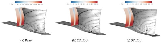 To illustrate the flow changes in the stator passage before and after optimization from multiple perspectives, Figure 25 compares the limited streamlines of the stator suction surface before and after optimization under near-stall conditions, with the contour at the stator outlet. It can be observed that compared with the prototype, after 3D optimization, the range of low-energy fluid accumulation on the stator suction surface is reduced, and the focus near the trailing edge of the blade root suction surface disappears, which means that the centralized shedding vortex disappears, the range of flow separation is reduced, and the degree of blockage is diminished. However, due to the increase in suction surface separation on the leading edge of the blade top and the absence of entrainment of the concentrated shedding vortex, the velocity in the passage of the blade top decreases, and the migration of low-energy fluid to the lower half of the height increases significantly under the action of stacking line optimization. It can be observed more clearly from the contour that the blade passage of the prototype stator is blocked due to the separation near the hub area, while the low-speed return area of the upper half of the stator is reduced due to the entrainment of concentrated shedding vortices. The blockage zone at the blade root of the 3D-optimized configuration is eliminated, and the distribution of the low-speed zone is more uniform in the span, thus avoiding premature stalling and improving the stall margin.
