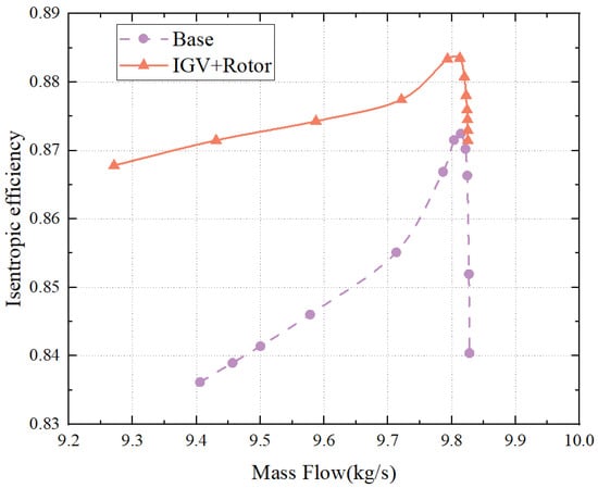 In conclusion, the improvement in efficiency observed in the optimized configuration under design conditions is due to the combination of 2D profile optimization and stacking line optimization. The 2D profile optimization changes the shock structure of the rotor, reduces the loss caused by the interaction between the shock and the rotor’s boundary layer, and weakens the intensity of the radial migration flow. On the other hand, the stacking line optimization brings the shock closer to the trailing edge in the upper half of the rotor, increasing the intensity of the radial migration flow. Additionally, the stacking line optimization eliminates the separation zone at the root of the stator blade and facilitates the migration of low-energy fluid from the blade tip to the blade, thus reducing the reflux zone at the tip.