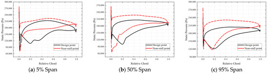 Figure 17 illustrates the pressure distribution on the stator blade surface at the design point, providing insight into the flow changes in the stator passage before and after optimization. The suction surface of the prototype stator blade root initially experiences a shock, leading to airflow separation on the blade surface and further deceleration and expansion. The pressure surface, however, lacks any shocks. On the other hand, the stator blade root flow in the 2D_Opt forms a shock before reaching 20% of the chord length, resulting in a rise in static pressure on the blade surface. Upon combination with the stacking line optimization, the suction surface of the stator blade root undergoes a more pronounced shock formed before 30% of the chord length, causing a sharp increase in the static pressure on the blade surface, and yet no boundary layer separation takes place on the blade surface. No significant changes are observed in the shock structure in the passage at 50% of the blade height. The airflow acceleration on the suction surface of the 3D_Opt is slightly greater than that of the other two configurations, but the static pressure distribution at 95% of the blade height remains unchanged.