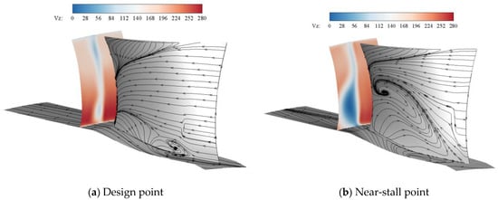 To understand the cause of the stalled condition affecting the prototype supersonic compressor, the compressor was analyzed both with and without the stator. In Figure 20, the legend “Base” represents the prototype compressor, and the legend “IGV+Rotor” represents the condition where the stator is removed from the prototype compressor. As observed in Figure 20, the compressor was found to work at a lower flow coefficient without the stator, suggesting that the stall originates from the stator. Figure 21 illustrates the pressure distribution on the stator blade surface at the design point and near-stall point, providing insight into the flow changes in the stator passage. It can be observed that the shock waves in the channel are enhanced under near-stall conditions due to the change in the attack angle. The relative Mach number distribution was then analyzed at various blade heights in the baseline design under both design conditions and near-stall conditions, as depicted in Figure 22. It was observed that the flow field in the stator blade root area was severely degraded, and the low-speed region expanded to encompass the entire blade passage. The shocks became stronger and moved forward in the mid-blade region, while the Mach number at the leading edge of the blade tip increased, and the low-speed zone at the trailing edge decreased. Figure 23 compares the limited streamline distribution on the stator suction surface of the baseline design and reveals that under near-stall conditions, the small-scale, low-speed zone near the blade root caused by the shock developed into a full-blown three-dimensional stall, resulting in numerical divergence. This increased the entrainment of concentrated shedding vortices [29,30] and also led to an increase in the axial velocity of the tip fluid, explaining the decrease in the low-speed zone at the trailing edge of the blade tip.
