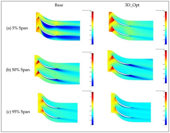 The relative Mach number contour for each blade height of the rotor is shown in Figure 15. At 5% of the blade height, the front end of the blade is relatively straight, causing the airflow to decelerate after encountering an inlet oblique shock and then continuing to accelerate in the passage to form a second shock on the suction surface of the blade. After 2D profile optimization, the front camber angle decreases, the straight section of the front end of the blade is elongated, and the acceleration of airflow in the passage is more pronounced, resulting in the formation of a stronger shock. The shock structure at the blade roots remains unchanged with the optimization of the stacking line. The intensity of the second shock is comparable between the prototype and the 2D_Opt. At 50% of the blade height, there is a significant change in the shock structure in both the prototype and optimized blade passages. The prototype channel exhibits two oblique shocks and one normal shock, causing a noticeable separation of the suction surface boundary layer. After the 2D profile optimization, the channel shock structure remains as two oblique shocks and one normal shock. However, due to the decrease in the front camber angle and the increase in the merge chord, the second oblique shock is detached from the normal shock, and the position of the normal shock is closer to the blade trailing edge. This change causes the pressure surface to form two shock waves, and the strength of the positive shock wave in the channel is weakened, which has the benefit of decreasing the loss caused by the shock. The shock structure in the channel becomes consistent with that of the 2D profile optimization when combined with stacking line optimization. In the upper area, the optimized configuration is consistent with the original shock structure, and the shock position remains unchanged after 2D profile optimization, as the blade shape change in the upper area is not significant. The normal shock in the upper area moves closer to the trailing edge with the optimization of the stacking line.
