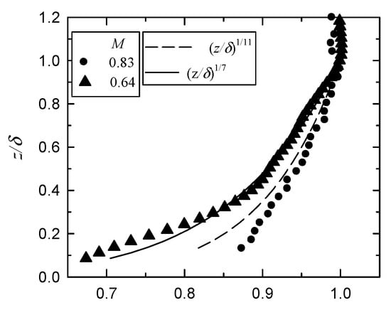 The test model is a flat plate and an instrumentation plate with an array of VGs, as shown in Figure 2. The flat plate has a 450-mm long flat plate with a leading edge of 3° to ensure that a turbulent boundary layer naturally develops and a 180-mm instrumentation plate with VGs. For surface pressure measurements using Kulite sensors and the PSP technique, there are nine interchangeable instrumentation plates with different VG configurations (CRV, CoV, and Ramp types; h* = 0.2, 0.5, and 1.0). The values of M are 0.64 and 0.83 ± 0.01 and the respective value of δ at 475 mm from the leading edge is 7.3 and 7.1 ± 0.2 mm [17]. If uncertainty is considered, the value of δ is approximately 7 mm for both Mach numbers. The normalized boundary layer profiles, as shown in Figure 3 (n ≈ 7–11 for the velocity power law), are determined using a Pitot probe and a transversing device. The respective Reynolds numbers based on δ, Reδ, are 1.63 and 1.69 × 105.