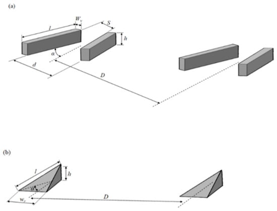 Ten pressure taps (2.5-mm in diameter) were machined perpendicular to the surface of each instrumentation plate along the centerline. Five pressure taps were upstream (spacing = 6 mm) and five were downstream (spacing = 12 mm) of the VGs, respectively, as shown in Figure 2. Three types of VGs (CRV, CoV, and Ramp) were used [16]. Sketches of the VGs are shown in Figure 4 and the parameters are listed in Table 1. All VGs had a length, l, of 1 δ and a value for α of 15°. The width of the CRV and CoV types, wv, was 0.2 δ and, for the Ramp type, wr, it was 0.5 δ. Pearcey [15] determined that there is increased mixing at the inner edge of the boundary layer as spacing increases. The spacing, D, between VGs was 3 δ (or D/h = 3–15) in order to establish an effective vortex pattern (D/h ≥ 3). An array of seven VGs was created. For the CRV type, the front, d, and rear, s, spacing are 1 δ and 0.5 δ, respectively.