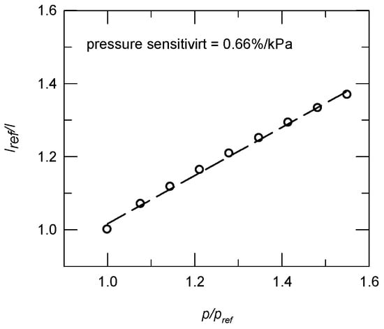 Figure 6 shows the calibration curve using 32 images, in which the applied pressure varied from 1.0 to 1.44 bar. There is a linear relationship between the intensity ratio for the luminescence, Iref/I, and the pressure ratio, p/pref, where Iref and pref are the reference intensity and pressure, respectively. The value for B(T), which is the pressure sensitivity, is 0.66%/kPa. Thermal quenching results in a temperature sensitivity of −0.4%/°C. For the wind tunnel test, the Iref was recorded by taking the wind-off images that were immediately captured after the wind tunnel was shut down. A median filter function (removing noise from an image) in the Matlab program was used to transform the luminescent intensity to surface pressure using the calibration curve [23].