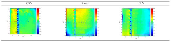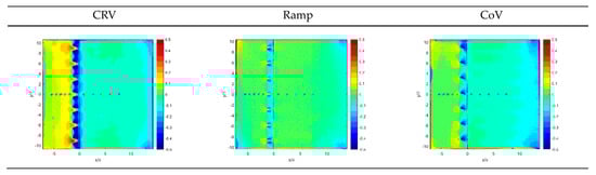 Examples of the global Cp pattern for a flat plate in the presence of VGs are shown in Figure 7 and Figure 8. For M = 0.64 and h* = 1.0, CRV VGs produce a stronger vortex (lower pressure). The vortex for CRV VGs decays faster than that for CoV and Ramp VGs. This is because of the interaction between two opposite vortices. For an airfoil, VGs are typically positioned on the upper surface to mitigate BLS. An increase in the value of Cp upstream of the VGs represents greater device-induced drag and a reduction in lift, which mitigates the benefits. The induced vortex is weakest for Ramp VGs. For M = 0.83, the effect of the VG configuration on the global surface pressure pattern is similar to that for M = 0.64. There is a stronger induced vortex near the VGs as M increases.