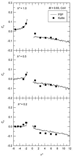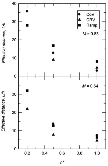 The effective distance is also scaled by the device height. The ratio between L and h is shown in Figure 14. The value of L/h ranges from 3 to 36, which is in agreement with the results by the study by Lin (L/h = 5–30) [3]. There is a decrease in the value of L/h as h* increases for M = 0.83 and 0.64, and the effect of M is less significant.