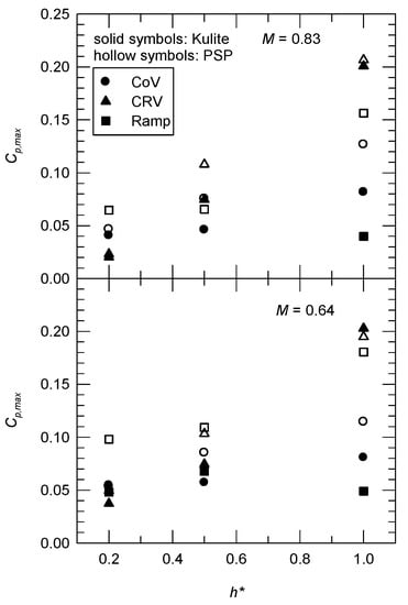 The drag penalty for VGs is defined in terms of the upstream peak mean surface pressure, Cp,max. The data for M = 0.64 and 0.83 are shown in Figure 10. The Kulite measurements (solid symbols) show that for CRV and CoV VGs, there is an increase in the value of Cp,max as h* increases, but not for Ramp VGs. This is due to the spatial resolution of the discrete pressure taps. The PSP data (hollow symbols) show the effect of h* on the value of Cp,max. Conventional VGs (h* = 1.0) result in an increase in value of Cp,max more significantly than MVGs (h* = 0.2 and 0.5). The effect is particularly noticeable for CRV and Ramp VGs. This is a factor in quantifying the overall performance of VGs for BLS control.