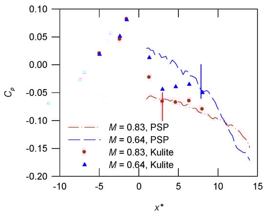 As shown in Figure 9, VGs create a region of downstream favorable pressure gradient. For h* = 1.0, the distribution of Cp in the presence of CoV VGs at y* = 0 is shown in Figure 11. The pressure measurements using Kulite sensors show that the value of Cp for M = 0.64 and 0.83 is approximately the same upstream of the VGs. There is a greater downstream favorable pressure gradient for M = 0.83 because the vortex is stronger. A mild variation in the value of Cp at farther downstream locations is determined.