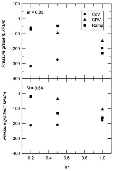 The downstream favorable pressure gradient depends on the strength of the VG-induced vortices. The measurements used Kulite sensors, as shown in Figure 12. For MVGs (h* ≤ 0.5), CoV VGs produce a greater pressure gradient downstream of the device than CRV and Ramp VGs. The value of the favorable pressure gradient decreases as h* increases for CRV and Ramp VGs, but not for CoV VGs. This phenomenon is more significant for M = 0.83. For a conventional VG, counter-rotating vortices (CRV and Ramp VGs) induce a greater favorable pressure gradient and there is less difference between the results for different VG configurations.