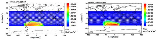 The particle radiation environment in the manned spaceflight orbit is mainly in the SAA of the Earth’s inner radiation belt [13]. Figure 2 shows an omnidirectional flux distribution diagram of the electron energy greater than 50 keV and the proton energy greater than 1 MeV calculated according to the AE8 and AP8 models. The maximum count of electrons with energy greater than 50 keV is 3.9 × 106, and the maximum count of protons with energy greater than 1 MeV is 2.9 × 104. These models only calculate the omnidirectional integral flux, which cannot be given as differential directional intensity and does not include the change in particle intensity when the space environment is disturbed. Upon disturbance, the intensity of the particles can vary by orders of magnitude, with durations ranging from hours to days.