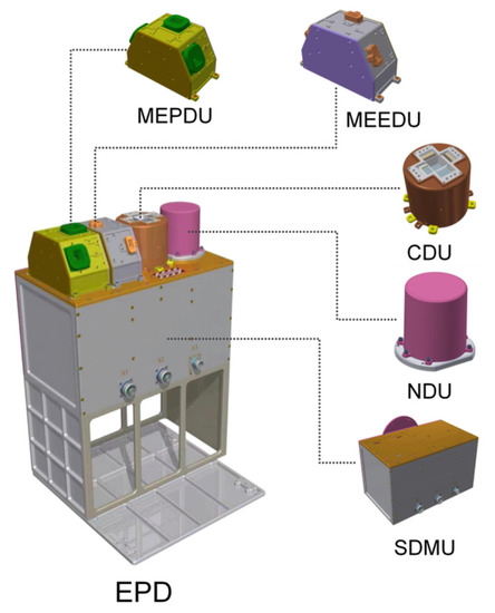 To date, the EPD of the Wentian laboratory cabin module has been the space particle radiation detector with the most complete particle types and the widest energy spectrum range in China. It is composed of a medium-energy electron detection unit (MEEDU), a medium-energy proton detection unit (MEPDU), a comprehensive detection unit (CDU), a neutron detection unit (NDU), and a shared data management unit (SDMU). The four detection units adopt different detection principles to realize the measurement of many particle types and wide energy spectrum coverage. The system composition of the EPD is shown in Figure 3.