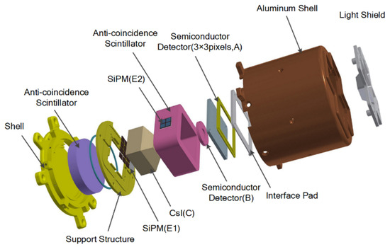 As shown in Figure 5, the probes of the CDU essentially comprise two ΔE detectors (A and B), a total energy scintillator detector (C), and two anti-coincidence detectors (E1 and E2), a total of five main detectors, which record the energy loss signal of the incident particles in the sensor.