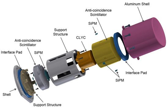 The neutron detection unit is mainly composed of CLYC crystal, anti-coincidence scintillator, photoelectric conversion multiplier device, and pre-amplification circuit, and packaged in an aluminum shell. The crystal and circuit are fixed by screws and adhesive tape. Its specific structure is shown in Figure 6.